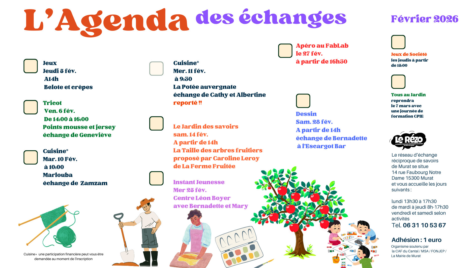 En parallèle des activités partagées figurant sur le calendrier ci-dessus, vous avez également la possibilité d’échanger vos savoirs avec d’autres membres du Rézo.