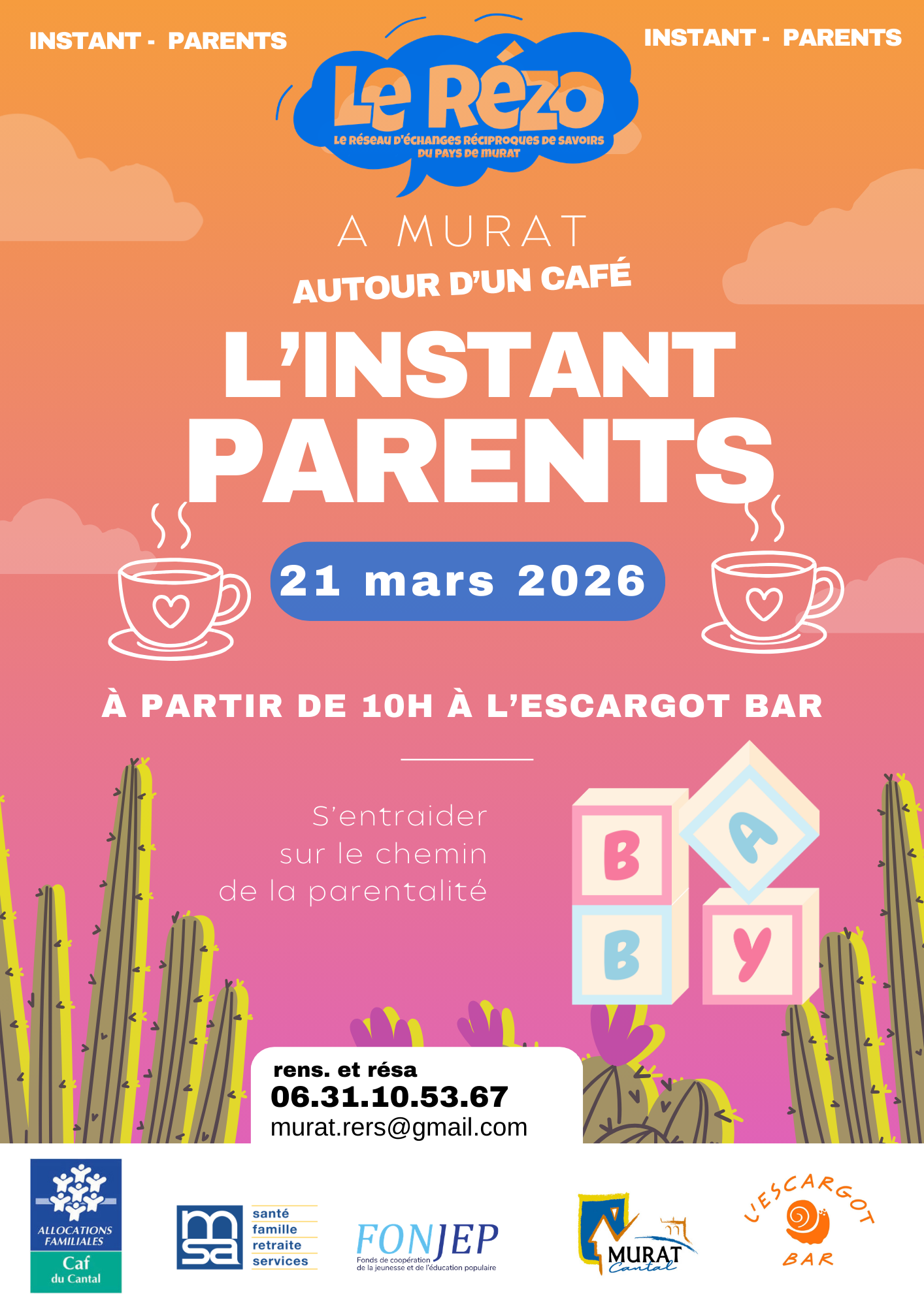 “ Le Café de L’Instant Parents du Rézo de Murat est un rendez‑vous convivial ouvert à tous les parents et futurs parents du territoire. C’est un espace simple et chaleureux pour écouter, échanger, partager des expériences et trouver du soutien dans la parentalité.